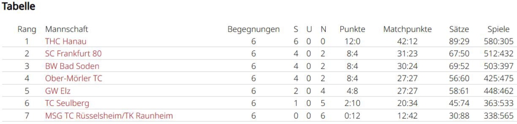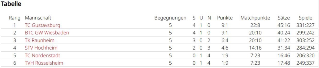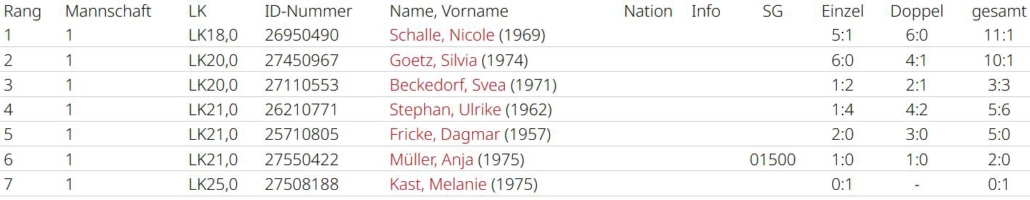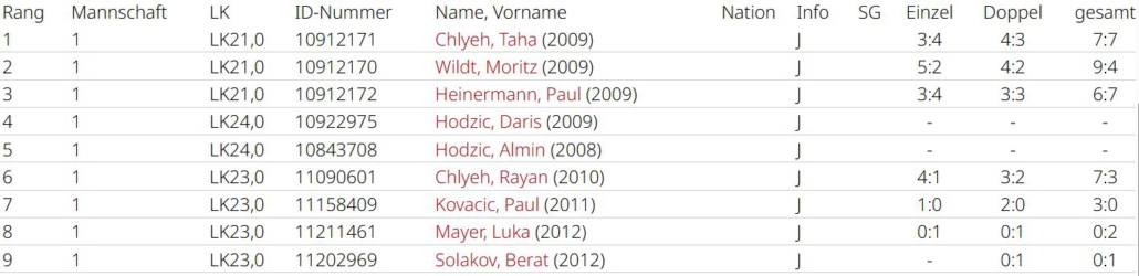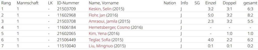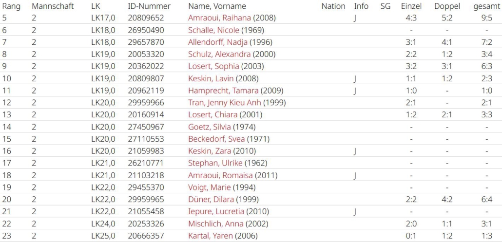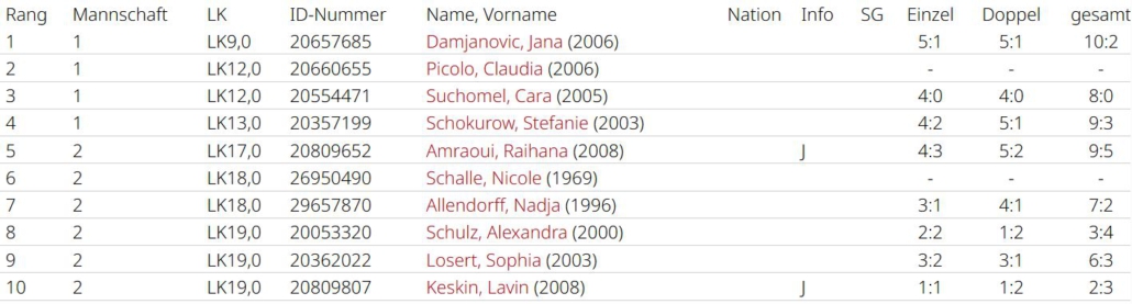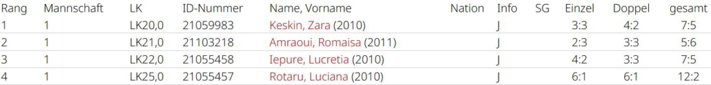Zara Keskin (3:3, 4:2) und Lucretia Iepure (4:2, 3:3) holten 7 Matchpunkte für das Team. Die Leistung von Romaisa Amraoui lässt sich nur schwer an den Zahlen ablesen (2:3, 3:3), da sie oft die bessere Spielerin war, sich aber zu selten mit Siegen dafür belohnt hat. Alle drei haben aber in Top-Spielen Luft nach oben. Luciana betritt als einzige alle Partien und verlor jeweils nur einmal (6:1, 6:1), sie war eine Bank an Position 4. Chiara Möser half zweimal aus und machte ihre Sache hervorragend, sie gewann alle ihre Matches. Alle Spiele in denen es um etwas ging verlor man leider mit 2:4. Man war nie chancenlos, ließ aber zu viel liegen. Am Ende mit Platz 5 eine eher enttäuschende Saison. Im nächsten Jahr wird mit Spielerinnen der zweiten Mannschaft aufgefüllt, da altersbedingt nur Romaisa Amraoui im Team bleiben kann. Dann ist das Gefälle innerhalb der Liga hoffentlich nicht mehr so groß.