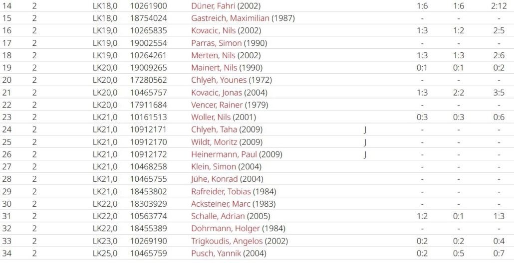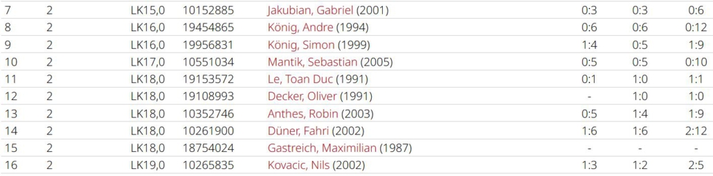 Das zweite Spiel zu Hause gegen Schwalbach II musste ohne unsere Nummer 1 Rayan stattfinden, der verletzungsbedingt kurzfristig ausfiel. Die Einzel glichen eher einer Lehrstunde für unsere Jungs, Luka und Mikka konnten sich im zweiten Satz wenigstens ein paar Spiele holen, insgesamt waren es in allen 4 Einzeln nur 8 Spiele. Im Doppel sprang sogar nur 1 Spiel heraus. Letztendlich hatte man nicht den Hauch einer Chance.