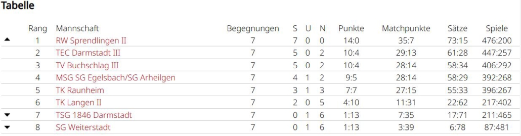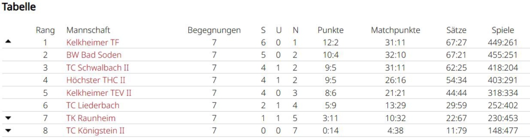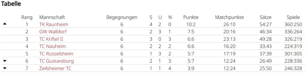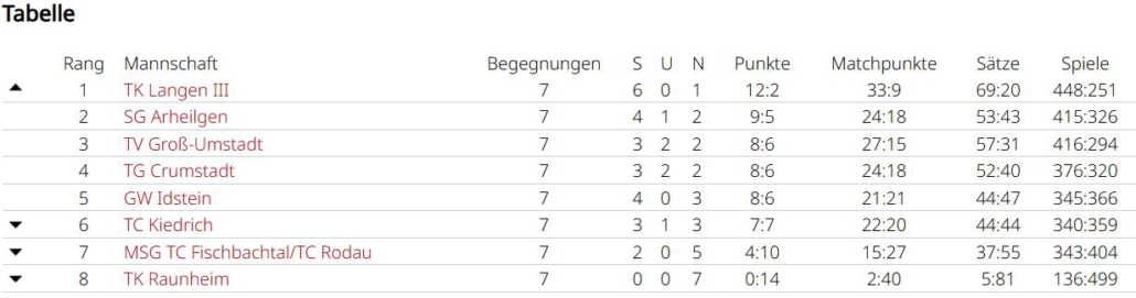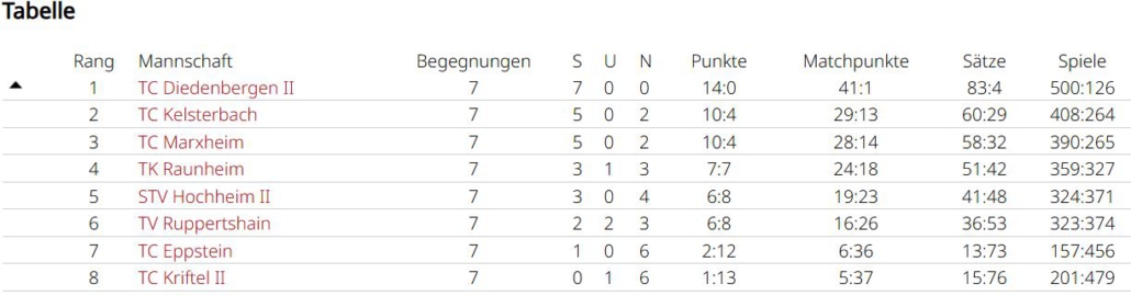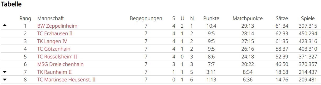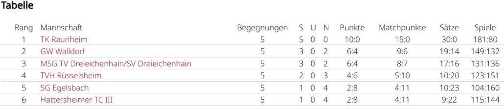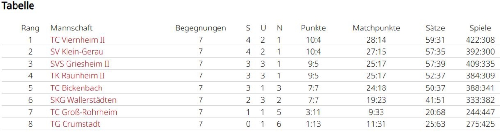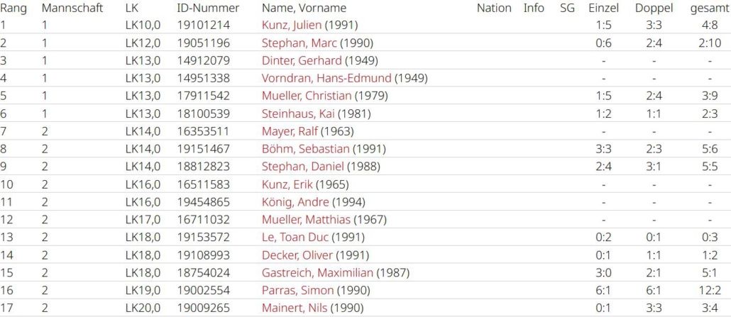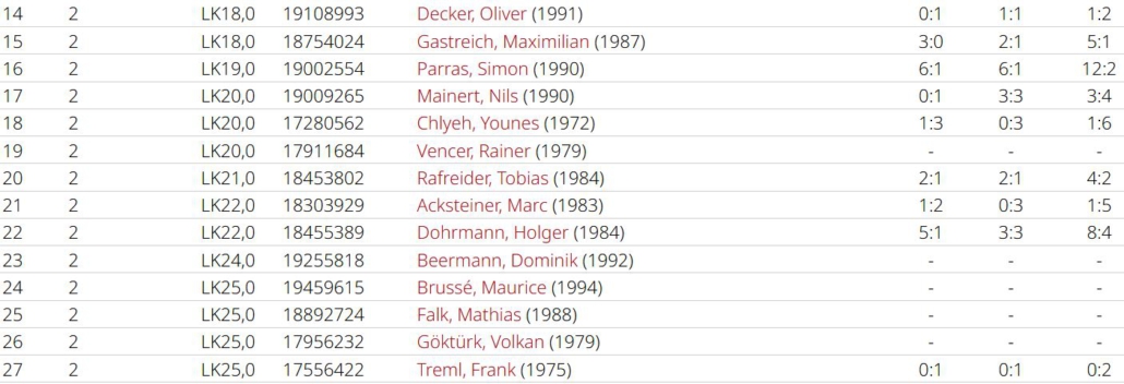 Man wollte sich im letzten Spiel in Griesheim aber nochmal ordentlich verkaufen. Simon und Tobias waren jeweils siegreich, Marc und Holger mussten sich sowohl im Einzel, als auch im Doppelgeschlagen geben. Simon und Tobias konnten ein 2:6 noch umbiegen. Sie kamen deutlich besser ins Spiel und konnten mit 6:1, 10:7 triumphieren. Das dritte Unentschieden der Saison führt das Team in der Abschlusstabelle auf Platz 4, allerdings auch nur einen Punkt hinter dem Aufsteiger. In einer sehr ausgeglichenen Liga waren am Ende Kleinigkeiten entscheidend. Eine Kleinigkeit war sicherlich, dass Spitzenspieler Max Gastreich gesundheitsbedingt nur 3 Matches bestreiten konnte, er gewann durch seinen großartigen Kampfgeist alle seine Einzel und verlor nur ein Doppel (3:0, 2:1). Simon Parras kann eine fast perfekte Bilanz vorweisen (6:1, 6:1), mit 12 geholten Matchpunkten liegt er nicht nur im teaminternen Vergleich ganz vorne, sogar ligaweit kann ihm hier niemand das Wasser reichen. Tobias Rafreider war jeweils 2 von 3 mal erfolgreich (2:1, 2:1). Holger Dohrmann konnte nur in einem Einzel bezwungen werden (5:1, 3:3) und bestritt nach Simon die zweitmeisten Matches. Younes Chlyeh und Marc Acksteiner waren jeweils einmal erfolgreich. Bei einer Team-Bilanz von 18:10 in den Einzeln und 7:7 in den Doppeln, kann man sicherlich noch in den Doppeln einiges rausholen, denn hier werden viele Spiele entschieden.