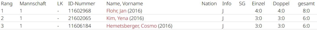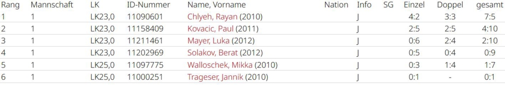 Jan Flohr konnte alle 8 Matches (4:0, 4:0) gewinnen, Yena Kim und Cosmo Hemetsberger waren ebenfalls bei all ihren Einsätzen erfolgreich (3:0, 3:0). Die Kids haben sich toll entwickelt und auch im Doppel gut miteinander harmoniert. Im nächsten Jahr geht es für alle in der U10 weiter.