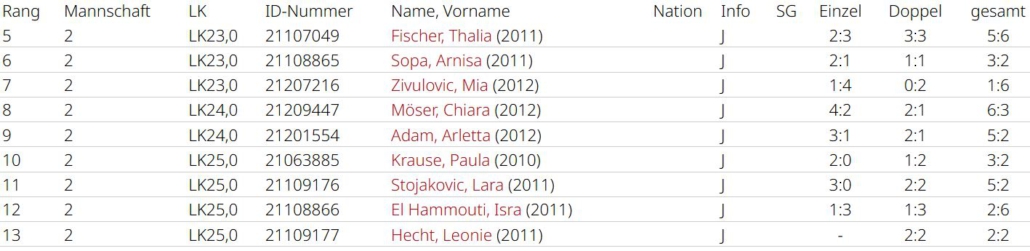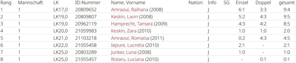Raihana Amraoui zeigte besonders im Einzel (6:1, 3:3) ihre Stärke, sie wurde nur vom Aufsteiger bezwungen und ist damit die zweitbeste Nummer 1 der Liga. Lavin Keskin konnte fünf Einzelsiege erringen (5:2, 4:3), Tamara Hamprecht war jeweils 4 Mal erfolgreich (4:3, 4:2), beide bleiben klar positiv. Des weiteren holten Zara Keskin (1:0, 1:0), Lucretia Iepure (2:1) und Luna Junker (1:0) Matchpunkte für das Team. Romaisa Amraoui belohnte sich leider nicht im Einzel, übernahm aber viel Verantwortung im Doppel (0:2, 4:3), sie spielte, wie Lavin, als einzige alle Doppel der Saison. Im nächsten Jahr versucht man wieder oben mitzuspielen.