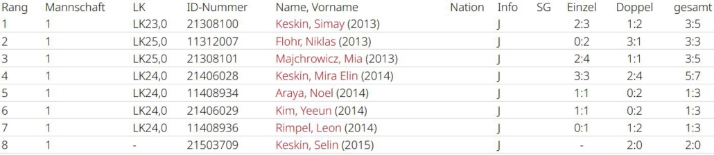Insgesamt kamen 8 Kinder zum Einsatz, davon konnten alle dem Team mindestens einen Sieg schenken, was sehr erfreulich ist. Simay Keskin hatte jeweils den schwersten Gegner vor der Brust, trotzdem gelangen ihr 3 Siege (2:3, 1:2). Niklas Flohr siegte mehrfach im Doppel (0:2, 3:1). Mia Majchrowicz bestritt alle Einzel (2:4, 1:1). Mannschaftsführerin Mira Keskin holte mit 5 Matchpunkten die meisten für das Team (3:3, 2:4), spielte aber auch als einzige in jedem Match Einzel und Doppel. Noel Araya und Yeeun Kim konnten jeweils ein Einzel gewinnen. Leon Rimpel und Selin Keskin gewannen einmal im Doppel. Am Ende landet man auf Platz 5, punktgleich mit Höchst, die man im direkten Duell aber 6:0 besiegen konnte. Im nächsten Jahr wird es anstatt einer gemischten U12 vermutlich eine weibliche U12 geben, da die Mädchen klar in der Überzahl sind.