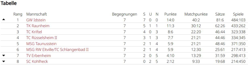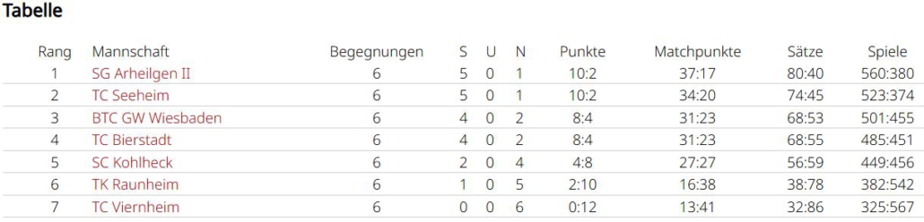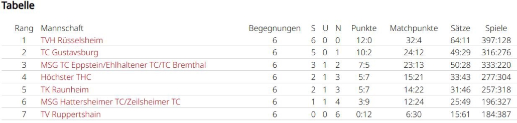 Die Damen 40 fuhren direkt zum Auftakt zu Hause gegen Zeilsheim mit 5:1 die ersten beiden Punkte ein. Im zweiten Spiel stand das Derby beim TC Rüsselsheim auf dem Plan. Nach den Einzeln, die Silvia und Anja holten, stand es 2:2 und man vermutete, dass das erste Doppel mit der starken Nummer 1 vom TC auflief. Somit setzte man mit Nicole und Anja alles aufs 2er Doppel. Mit etwas Glück ging dieser Plan auf. Verlor man noch den ersten Satz mit 6:7, glich man danach mit 6:4 aus. Im Matchtiebreak konnten unsere Damen 40 noch ein 2:7 in ein 11:9 kippen und blieben weiter ungeschlagen.
