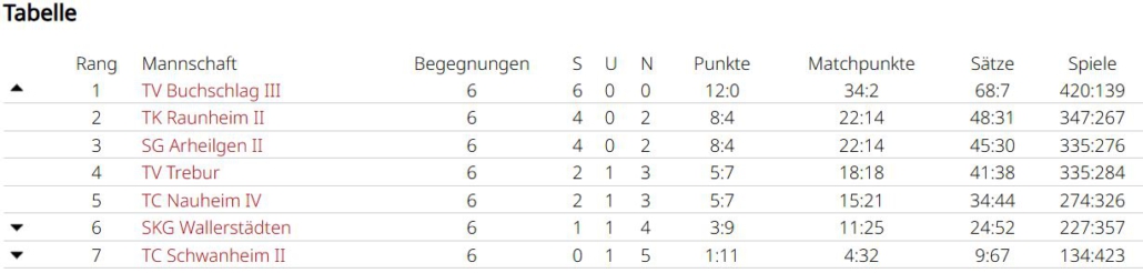 In Walldorf konnte man dreimal im CTB gewinnen, sowohl Nicole im Einzel, als auch beide Doppel (Nicole/Silvia und Svea/Ulrike) entschieden den Decider für sich. Durch das 5:1 bei GW Walldorf kletterte man an die Tabellenspitze, diese verteidigte man gegen Kriftel mit 4:2. Hier holten Ulrike und Dagmar das entscheidende Doppel mit 10:4 im Matchtiebreak.